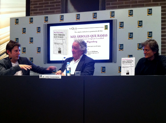 Más árboles que ramas se presentó en Casa del Llibre de Barcelona, ante un auditorio entregado al chispeante diálogo entre el periodista y el científico. Pep Bou, con quien Jorge Wagensberg estrenó el año pasado el espectáculo Berishit http://www.tusquetseditores.com/actualidad/la-historia-mas-bella-del-cosmos-jorge-wagensbert-y-pep-bou, remató el acto encerrando el libro en una gran burbuja de jabón.